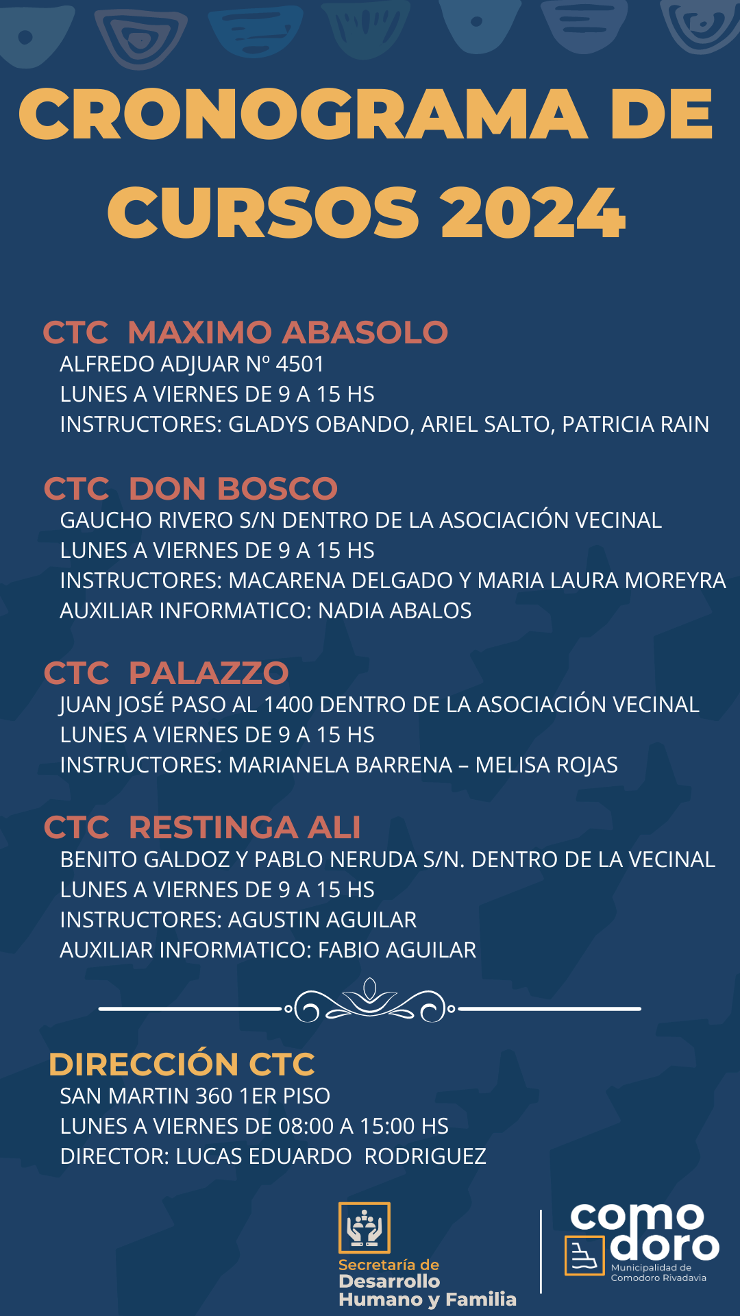 La Secretaria de Desarrollo Humano y Familia, a través de la Dirección de Alfabetización y Accesibilidad Digital, brinda a los ciudadanos los cursos que se dictan en los Centros Tecnológicos Comunitarios son espacios de formación que promueven el uso social de las TIC’s para impulsar el conocimiento y fortalecer la inclusión digital con el objetivo de promover la igualdad de oportunidades al acceder al uso de dispositivos y redes de manera gratuita.