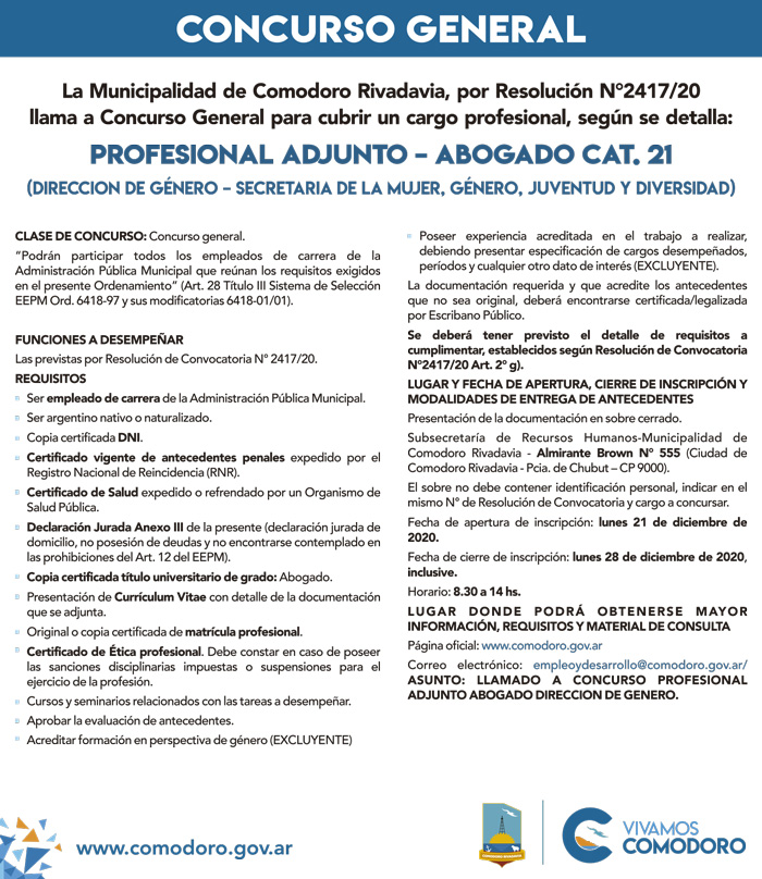 La Municipalidad de Comodoro Rivadavia, por Resolución N°2417/20 llama a Concurso General para cubrir un cargo profesional, según se detalla: