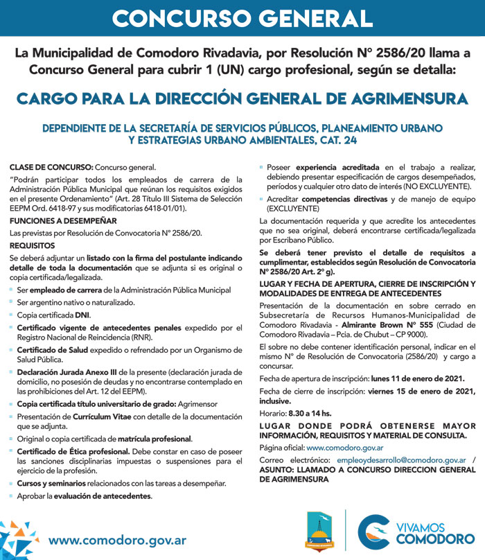 La Municipalidad de Comodoro Rivadavia, por Resolución N° 2586/20 llama a Concurso General para cubrir 1 cargo profesional, según se detalla: